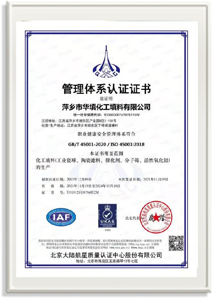 萍鄉市華填化工填料有限公司,位于320國道、109國道、浙贛鐵路、昌金高速公路貫穿其中,交通便利,是江西西部一顆燦爛明珠,創建于20世紀70年代初期,是中國石油天然氣股份有限公司“能源一號網”會員企業、中國石化物資采購電子商務網絡和中國海洋石油總公司采辦業務系統成員單位,是上海大學江西材料基因組工程產業研究院工業陶瓷產業創新聯盟基地,且通過ISO9001:2015質量管理體系、ISO14001:2015環境管理體系、ISO45001:2018職業健康安全管理體系認證的化工填料生產企業。公司擁有陶瓷、塑料、金屬填料、催化劑、活性氧化鋁、分子篩等產品生產線,現有固定資產3616萬元,占地面積3.8萬平方米。公司具有悠久的生產歷史、雄厚的技術力量和先進的生產工藝設備,可生產工業瓷球(支撐劑)、陶瓷、金屬、塑料質的規整、散堆化工填料及分子篩、催化劑、生化濾料、活性氧化鋁、石化助劑、活性炭、環保材料、耐火材料等系列的200多種規格型號產品。